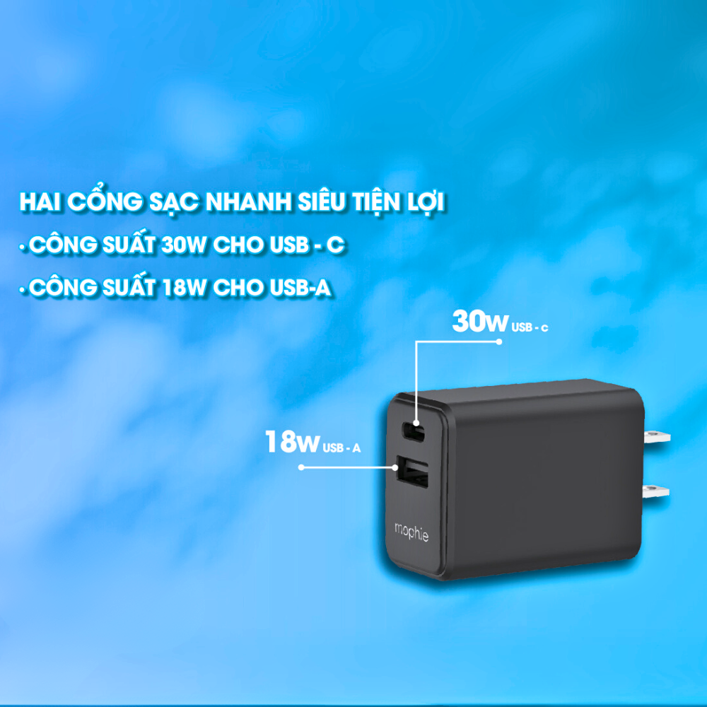Điểm nhấn lớn nhất của Củ sạc Mophie Essentials PD 30W 1A1C chính là công suất sạc 30W mạnh mẽ. Công suất này cho phép sạc nhanh đáng kể so với các củ sạc thông thường, đặc biệt là với các thiết bị hỗ trợ sạc nhanh như iPhone, iPad, điện thoại Android cao cấp và thậm chí một số laptop mỏng nhẹ. Bạn sẽ không còn phải chờ đợi hàng giờ để thiết bị đầy pin. Chỉ với vài chục phút sạc, Mophie Essentials PD 30W 1A1C có thể cung cấp đủ năng lượng để bạn tiếp tục công việc hoặc giải trí. Đây là giải pháp lý tưởng cho những người bận rộn, luôn cần thiết bị của mình trong trạng thái sẵn sàng.