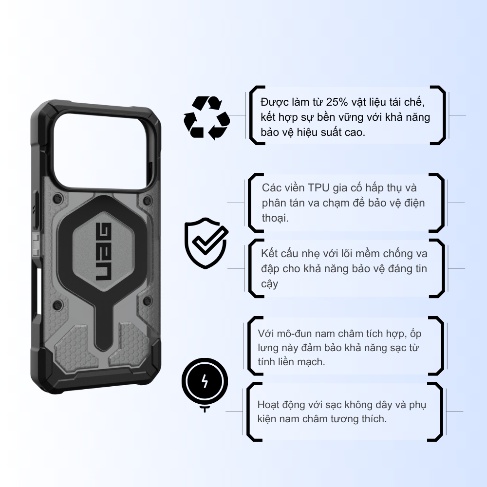 Trong cuộc sống năng động hiện nay, điện thoại thông minh là một công cụ không thể thiếu. Chúng ta phụ thuộc vào nó cho công việc, giải trí, và kết nối. Tuy nhiên, với giá trị ngày càng cao, việc bảo vệ điện thoại khỏi những va đập, trầy xước và rơi vỡ là mối quan tâm hàng đầu. Ốp lưng UAG Pathfinder Clear hít từ tính chính là giải pháp tối ưu, mang đến sự kết hợp hoàn hảo giữa khả năng bảo vệ mạnh mẽ theo tiêu chuẩn quân đội, thiết kế trong suốt tinh tế và tính năng tương thích MagSafe hiện đại.