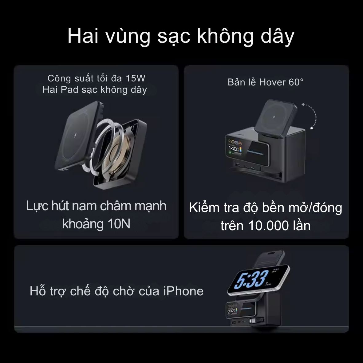 Cuktech 15 Charging Station Ultra GaN được thiết kế để đáp ứng mọi nhu cầu sạc của bạn với một loạt các cổng đầu ra linh hoạt. Thông thường, một trạm sạc cao cấp như thế này sẽ bao gồm nhiều cổng USB-C hỗ trợ Power Delivery (PD) và các cổng USB-A hỗ trợ sạc nhanh. Điều này cho phép bạn sạc đồng thời một chiếc MacBook Pro, một chiếc iPhone đời mới, một iPad và thậm chí cả tai nghe không dây của mình chỉ từ một nguồn điện duy nhất. Sự linh hoạt trong lựa chọn cổng sạc biến Cuktech 15 Charging Station Ultra GaN thành một trung tâm năng lượng thực sự, loại bỏ sự lộn xộn của nhiều bộ sạc và dây cáp riêng lẻ.