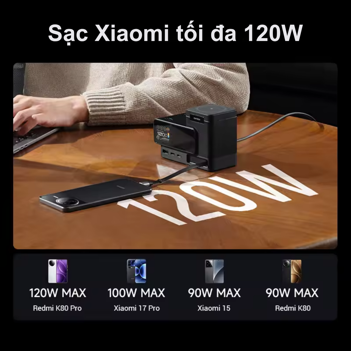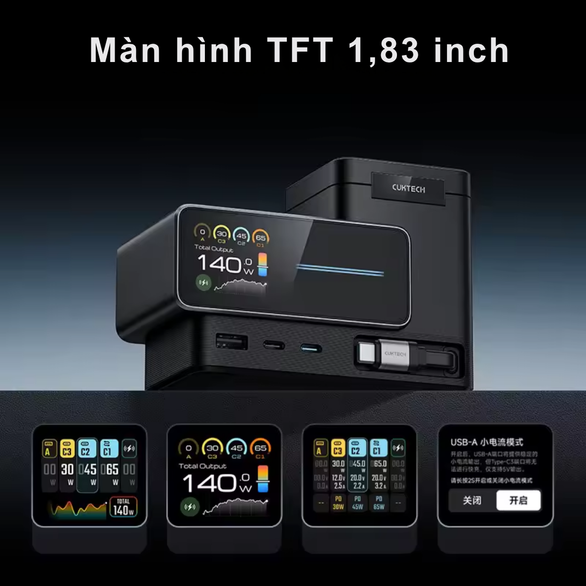 Trái tim của Cuktech 15 Charging Station Ultra GaN là công nghệ Gallium Nitride (GaN) đột phá. Công nghệ GaN cho phép các bộ sạc hoạt động ở nhiệt độ thấp hơn, hiệu quả hơn và quan trọng nhất là có kích thước nhỏ gọn hơn đáng kể so với các bộ sạc silicon truyền thống. Với tổng công suất đầu ra lên đến 140W, trạm sạc này có thể dễ dàng cung cấp năng lượng cho những thiết bị “khát” điện nhất của bạn, bao gồm cả các mẫu laptop mạnh mẽ yêu cầu công suất sạc cao. Công suất 140W đảm bảo rằng bạn có thể sạc nhanh nhiều thiết bị cùng lúc mà không làm giảm hiệu suất tổng thể. Cuktech 15 Charging Station Ultra GaN thực sự là một “nhà máy điện” thu nhỏ trên bàn làm việc của bạn.